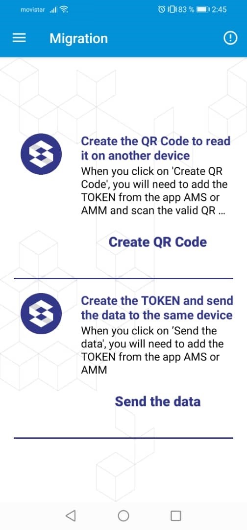 Step 8: Click on the “Migration” option. Two options will be displayed on the screen: “Create the QR code to read it on another device (Create QR Code)” and “Create the TOKEN and send the data to the same device (Send the data)” (see figure 10).