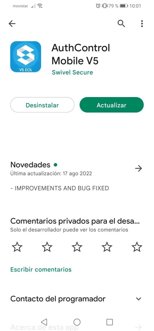 Step 1: Verify that the AuthControl Mobile V5 app is updated on the device to version 5.4.2, otherwise you will need to run the app update. (Go to the info page of the application and verify that the information it shows you is the one indicated in the figure 1).