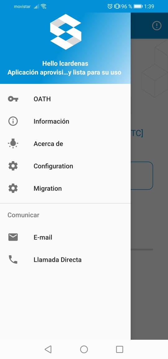 Step 7: Enter the AuthControl Mobile V5 app, on the home screen where the OATH code is displayed, click on the options menu at the top left of the screen, the following options will be displayed: “OATH”, “Information”, “About”, “Settings”, “Migration”, “Email” and “Direct call” (see figure 8 and figure 9).